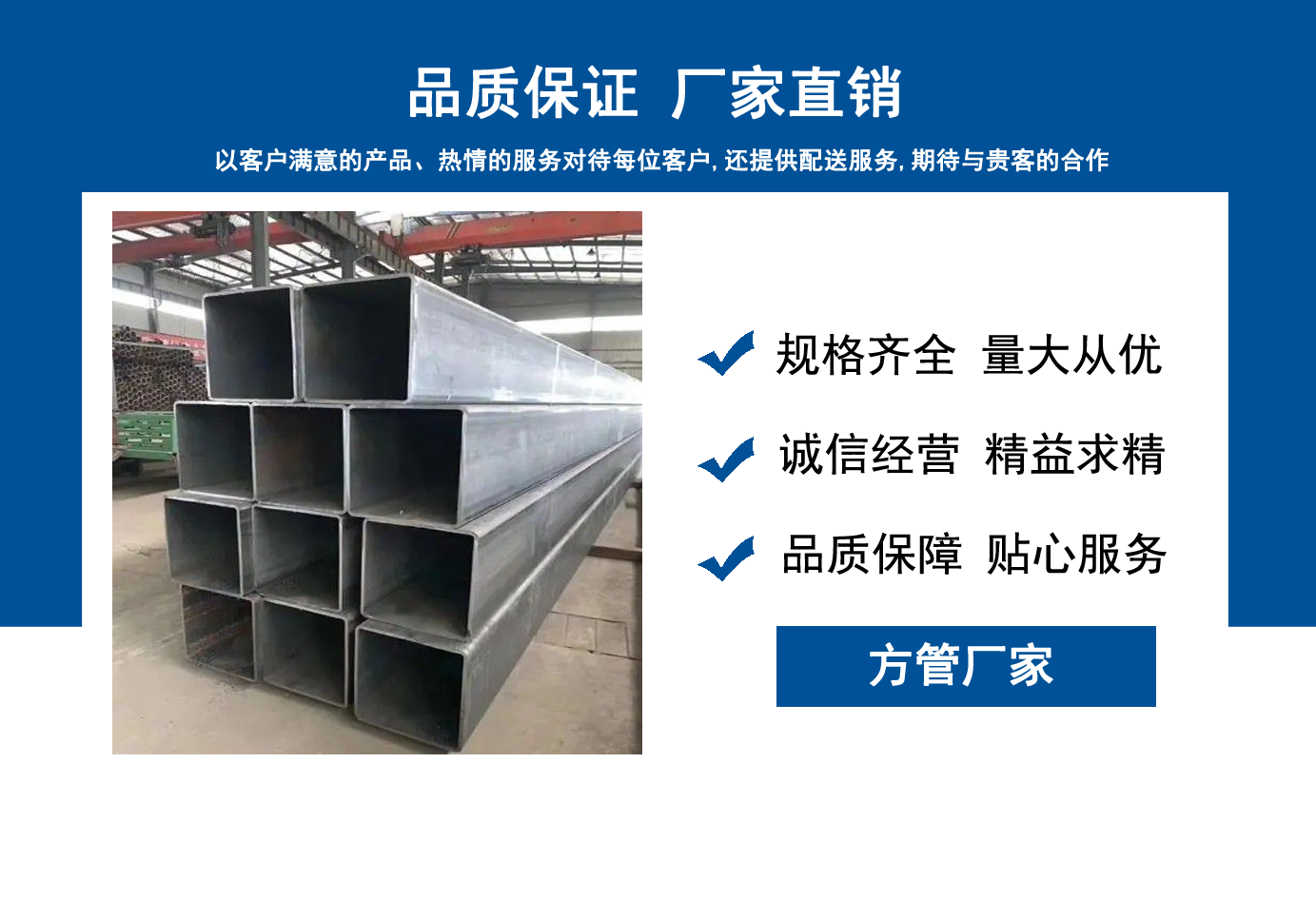 山東方管廠主要生產Q355B方管,Q355C方管,Q355D方管,Q355E方管,低合金方管等,曾多次為客戶解決了各種無縫管疑難問題,經不斷的創新與努力,得到了客戶良好的信譽和稱贊。  公司秉承質量、服務是我們尋求發展的唯一途徑,為客戶提供極具市場競爭力的高品質產品,愿與客戶一起進步、共享成功!  我公司秉承“誠信經營,服務周到”的經營原則,全力以赴,給客戶周到滿意的服務。“誠信、專業、認真、服務”是我們的宗旨。幾年來我們用專業的技術和周到的服務贏得了廣大客戶和供應商的信賴,與各大企業有著廣泛的合作和聯系,受到了業內好評。我們會以優良的產品、優惠的價格、優先的貨期、優良的服務,珍惜客戶給予我們的每一個機會。...
